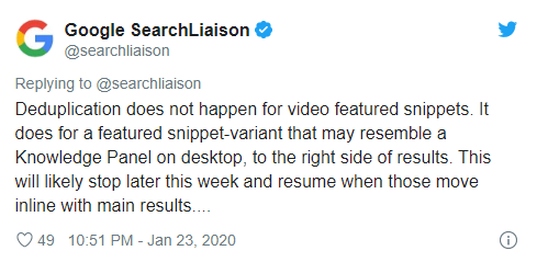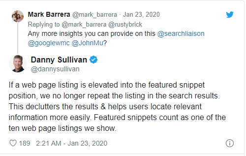 On January 2020 Google search Liaison and Danny Sullivan notify a big forking about long standing Featured Snippet Practices. Generally, Google exhibit the URL used in Feature snippet among the top organic result. But now Danny announced that google will no longer Duplicate feature snippets URL’s.